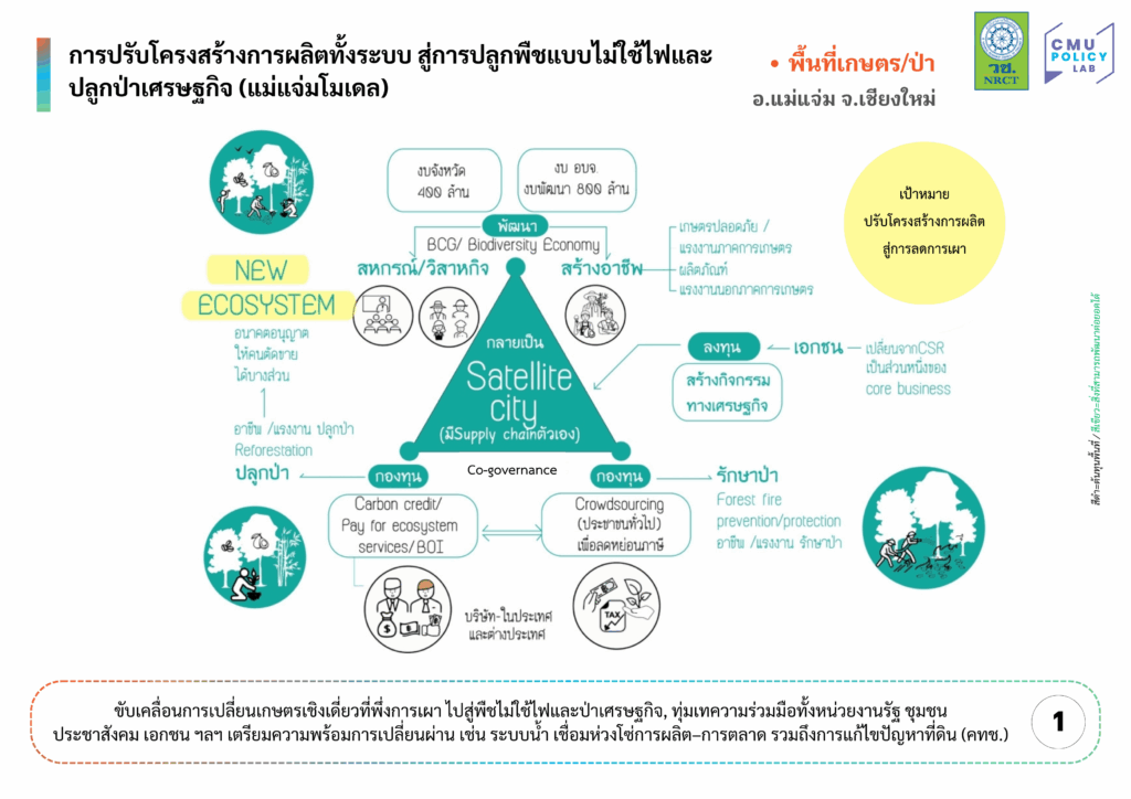 การปรับโครงสร้างการผลิตทั้งระบบสู่การปลูกพืชแบบไม่ใช้ไฟและปลูกป่าเศรษฐกิจ (กรณีศึกษาแม่แจ่ม) เพื่อขับเคลื่อนการเปลี่ยนเกษตรเชิงเดี่ยวที่พึ่งการเผา ไปสู่พืชไม่ใช้ไฟและป่าเศรษฐกิจ จำเป็นต้องอาศัยการทุ่มเทความร่วมมือทั้งหน่วยงานรัฐ ชุมชน ประชาสังคม เอกชน ฯลฯ เตรียมความพร้อมการเปลี่ยนผ่าน เช่น ระบบน้ำ เชื่อมห่วงโซ่การผลิต–การตลาด รวมถึงการแก้ไขปัญหาที่ดิน (คทช.)  ทั้งนี้ หากวิเคราะห์ต้นทุนและประสิทธิผลในทางเลือกตัดสินใจเชิงนโยบายดังกล่าว จะพบว่า ในด้านต้นทุนอาศัยงบรายชุมชนราว 5 ล้าน รวมต้นทุนทางสังคมและการเปลี่ยนผ่าน คือการฝึกอบรมและเปลี่ยนวิถีการผลิตของเกษตรกร เวลาที่ต้องใช้ในการปรับตัว เช่น การปลูกป่าให้ฟื้นตัวใช้เวลาเป็นปีและอาจมีต้นทุนแฝงจากการสูญเสียรายได้เดิม(ในช่วงปรับตัว) รวมถึงต้องใช้เวลาและทรัพยากรในการประสานงานภาคส่วนต่างๆ (รัฐ-เอกชน-ชุมชน) ในด้านประสิทธิผลที่มุ่งเน้นคือลดการเผาและสร้างเศรษฐกิจทดแทนไปพร้อมกัน ซึ่งการปรับโครงสร้างทั้งระบบ คาดว่าจะมีประสิทธิผลระดับชุมชนสูง อย่างน้อยราว 70% (สัดส่วนช่วยลดเผาในพื้นที่) โดยต้นทุน-ประสิทธิผล (cost/ effect) ประมาณ 0.07 (เทียบการลงทุนในหน่วยล้านบาทต่อการเปลี่ยนแปลงระดับชุมชน 1% โดยดีที่สุดคือเข้าใกล้ศูนย์มากที่สุด) นับว่าคุ้มค่าในระยะกลาง-ยาว