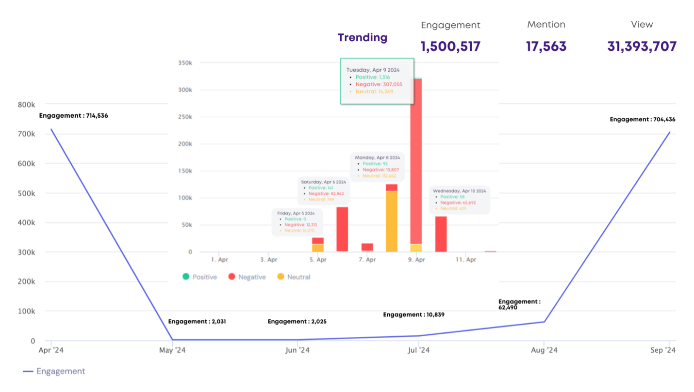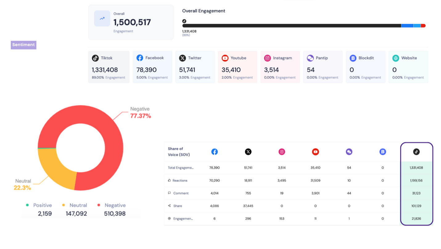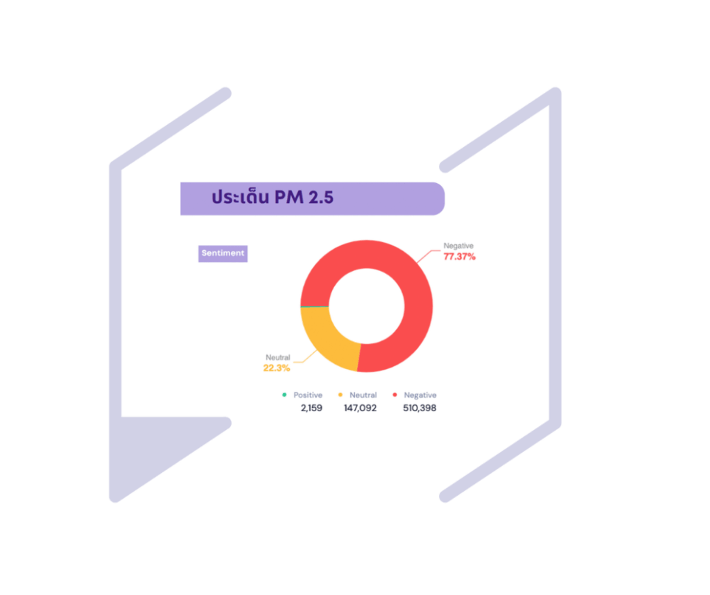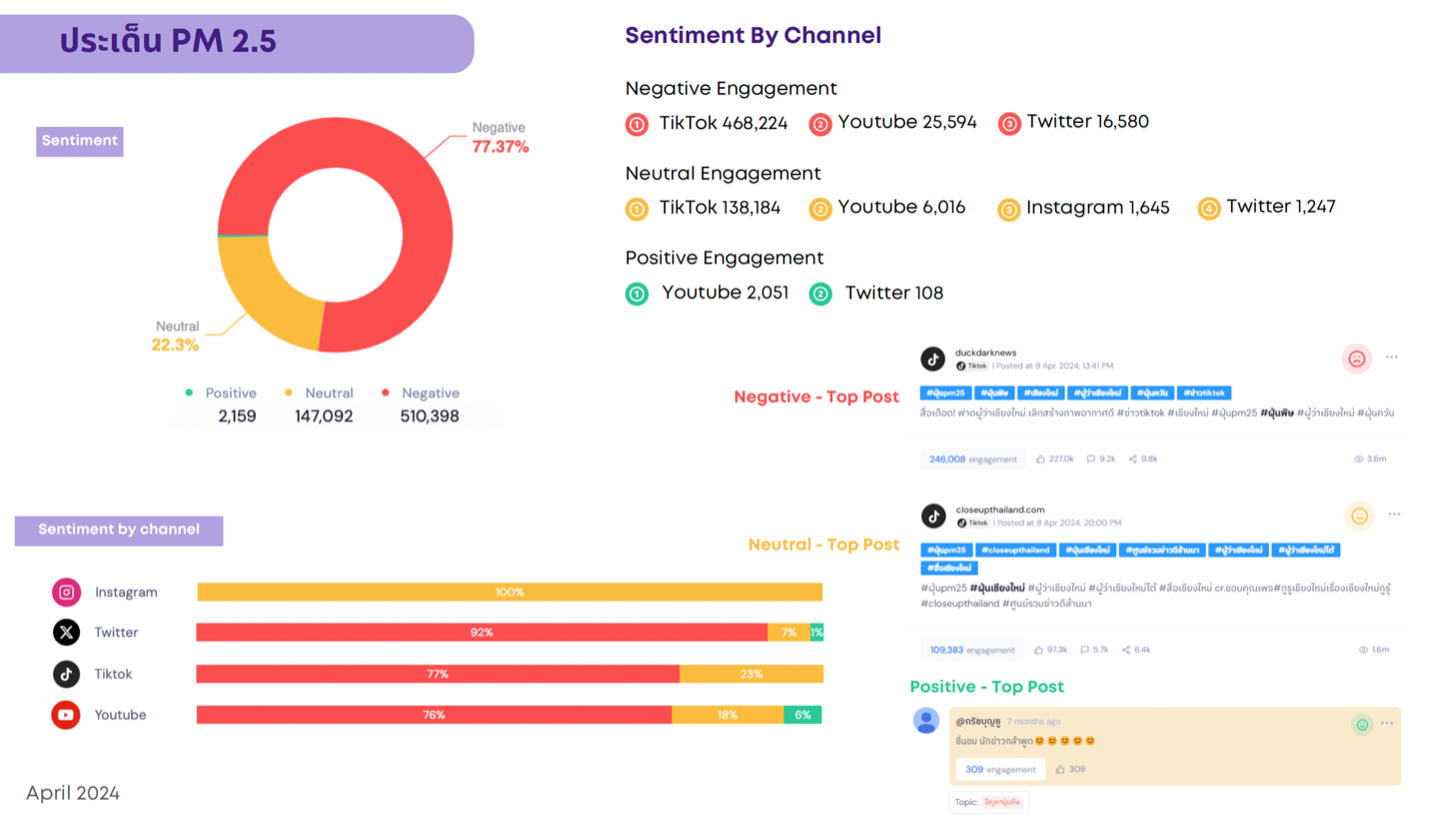 จากการรับฟังเสียงประชาชน (Social listening) ด้วยเครื่องมือ AI ตลอดปีที่ผ่านมา เพื่อวิเคราะห์มุมมองของภาคสังคมต่อสถานการณ์และมาตรการการรับมือ PM2.5 ในพื้นที่เชียงใหม่จากสื่อสังคมออนไลน์ พบว่าตลอดปีมียอดรวม Engagement ประเด็น PM2.5 มากถึง 1,500,517 ครั้ง โดยเฉพาะผ่าน TikTok, Facebook, X, YouTube และ Instagram โดยต้องยอมรับว่าในภาพรวมมีอารมณ์ความรู้สึกสาธารณะ (sentiments) ในเชิงลบมากที่สุด (ร้อยละ 77.37) ดังสรุปในแผนภาพด้านล่าง