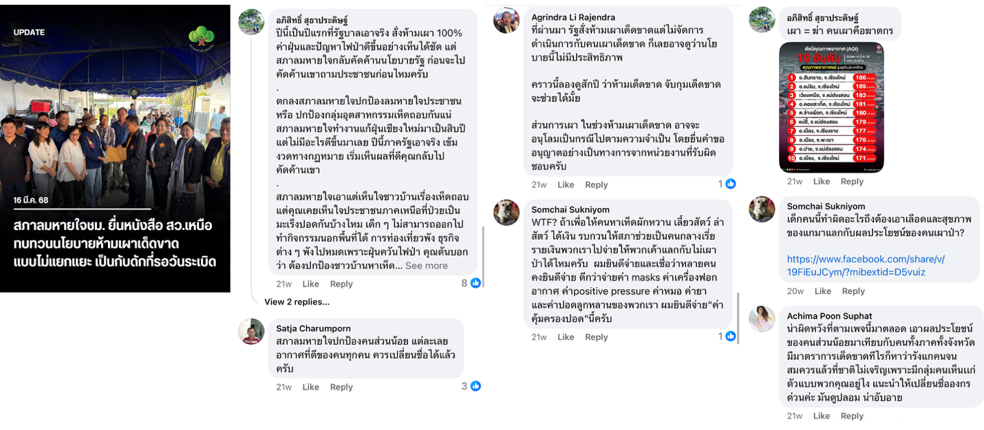 นอกจากนั้น อีกขอสังเกตสำคัญคือความไม่สอดคล้องระหว่างแนวทางควบคุมสถานการณ์ของรัฐ สภาพความเป็นจริง และความคาดหวังของสังคม จากกรณีของการห้ามเผา (Zero burning) ที่นำไปสู่ความกดดัน ความไม่พอใจ หรือแม้แต่ความโกรธของประชาชนในชนบท เพราะเห็นว่ามักง่าย โดยเข้ามาบีบแต่ไม่สร้างทางเลือก ในขณะเดียวกันกับที่ไปสร้างความขัดแย้งระหว่างคนชนบทกับคนเมืองที่ยังขาดความเข้าใจในเงื่อนไขของการใช้ไฟของชาวบ้าน ดังปรากฏให้เห็นในโพสต์จำนวนมากในช่วงดังกล่าว  โดยภาคสังคมที่ออกมาเป็นตัวกลางในการส่งเสียงแทนชาวบ้าน ถูกทำให้กลายเป็นเหยื่อของการวิพากษ์วิจารณ์แทนรัฐ จนปิดกั้นพื้นที่ในการแลกเปลี่ยนเรียนรู้และหาทางออกร่วมกันอย่างสร้างสรรค์ บนฐานของการเข้าอกเข้าใจและเห็นอกเห็นใจกันมากกว่านี้