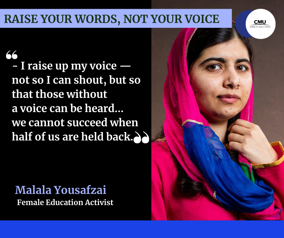“ฉันเปล่งเสียงขึ้นไม่ใช่เพื่อตะโกน แต่เพื่อเป็นเสียงแทนผู้คนที่ไม่มีเสียง ให้พวกเขาถูกรับฟัง… พวกเราไม่สามารถประสบความสำเร็จได้ หากครึ่งหนึ่งของพวกเรายังคงถูกฉุดรั้งไว้ข้างหลัง”